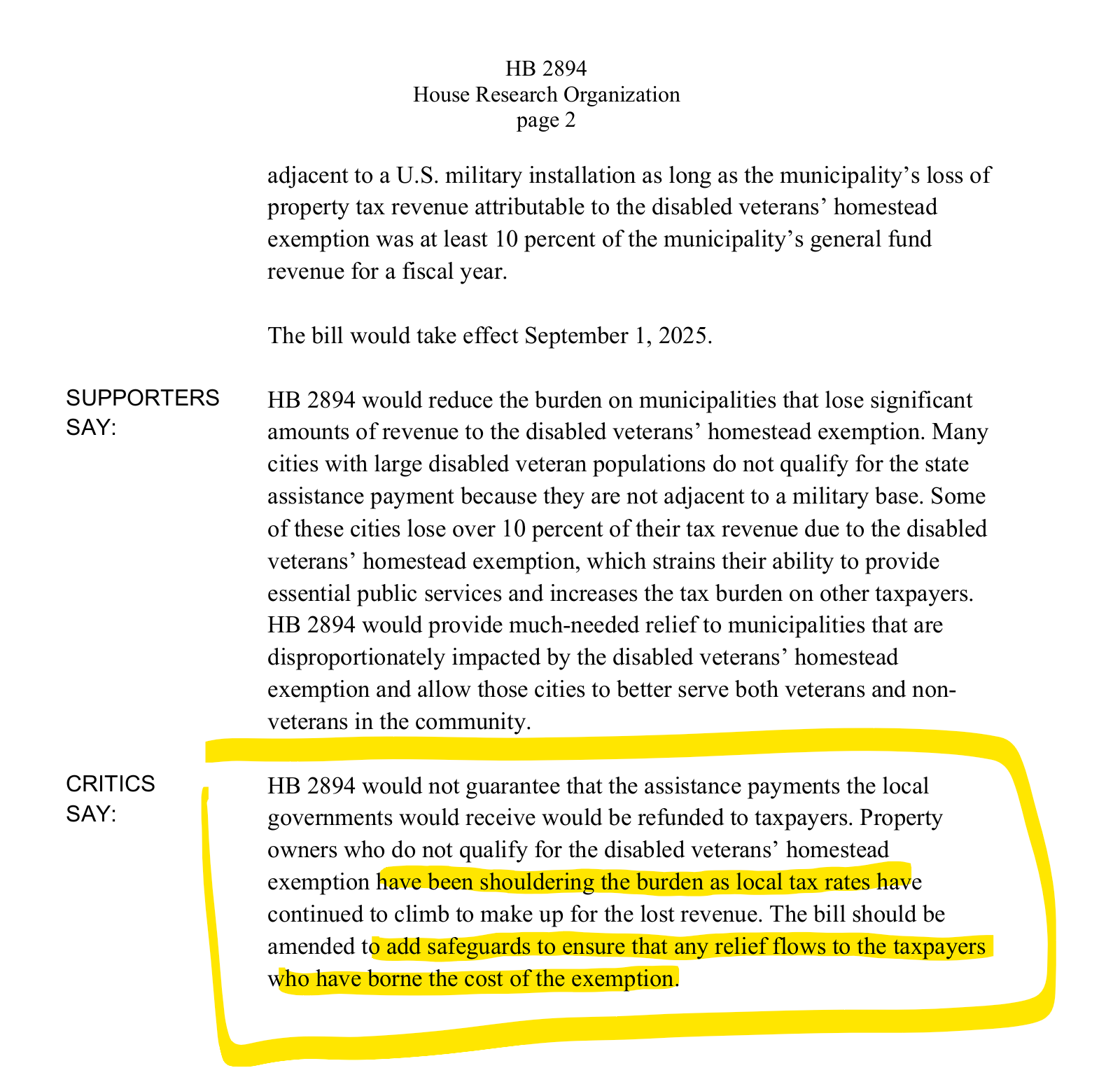 I have testified for three successive Legislative sessions for Texas to fund the 100% DV exemption so that Harker Heights Citizens could stop paying extra property taxes to provide services for all.